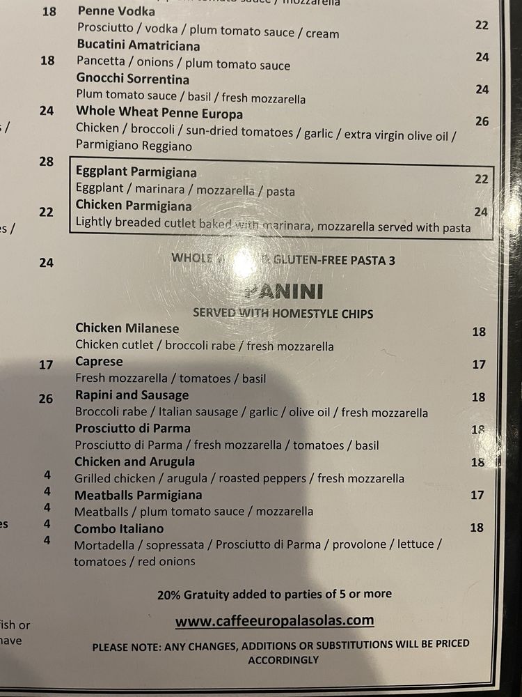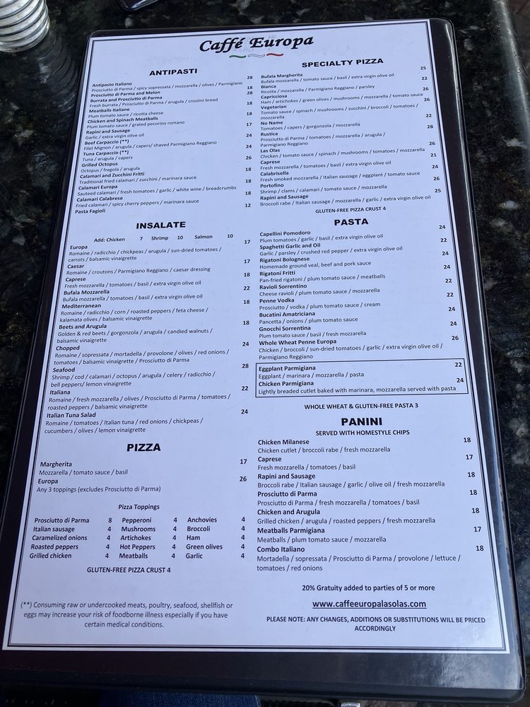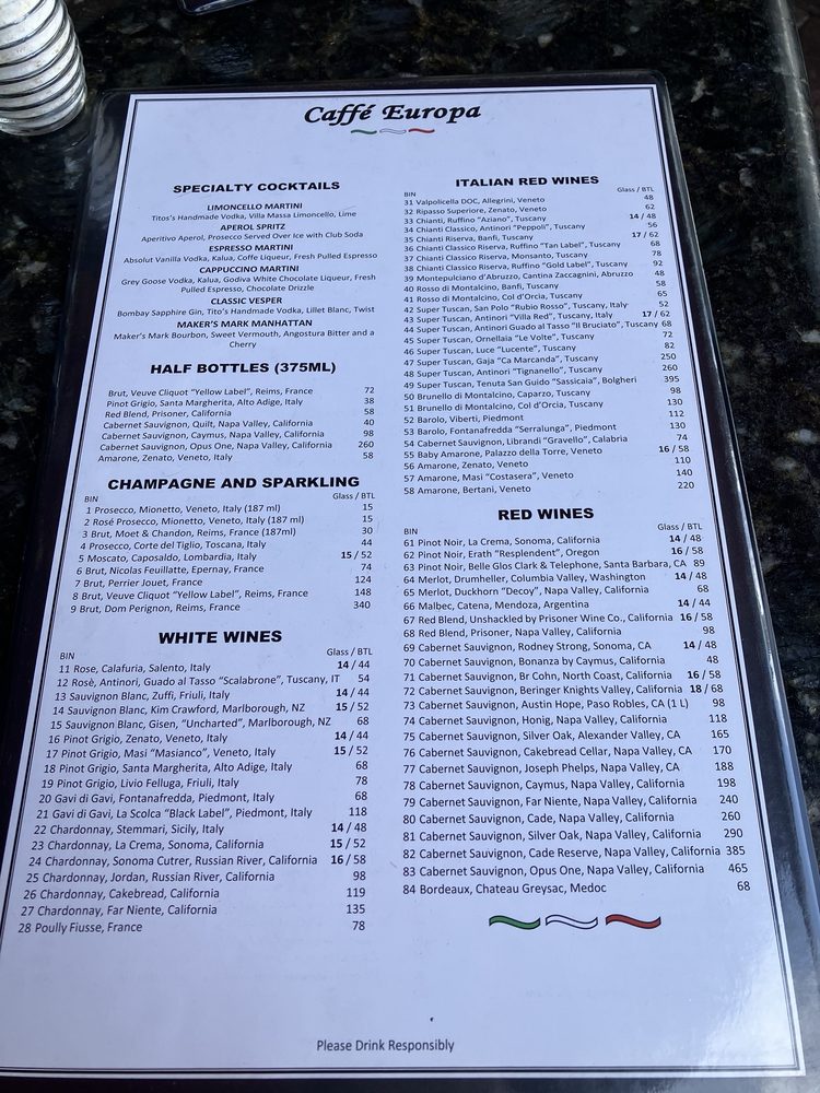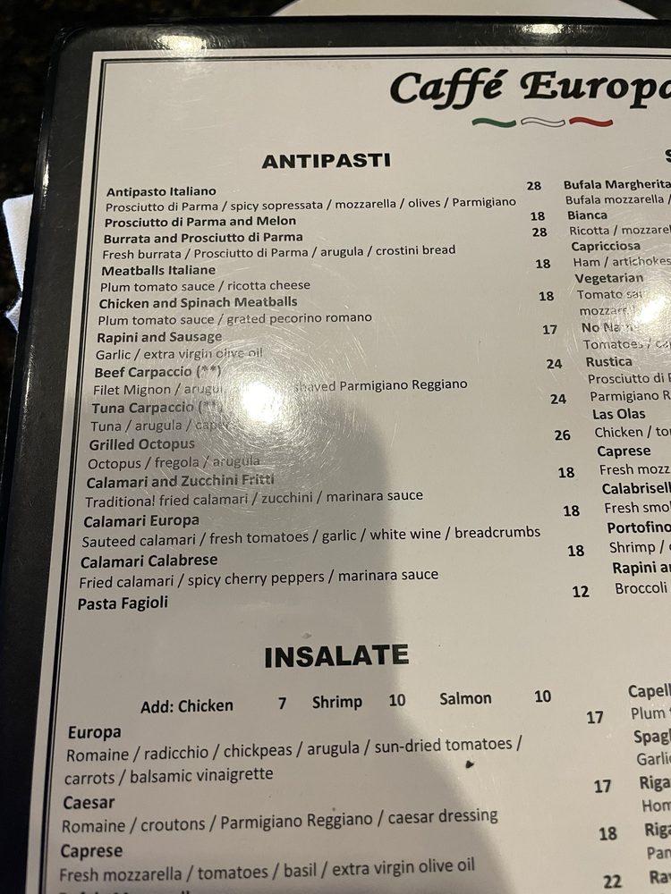 Caffe Europa, located on Las Olas Boulevard in Fort Lauderdale, offers authentic Italian cuisine in a charming atmosphere. The menu features a variety of antipasti, insalate, and specialty pizzas, such as the Rustica and Caprese. Customers rave about the delicious lasagna, shrimp pasta, and Bianca pizza. The complimentary bread served with olive oil is a crowd favorite. With options for takeout, delivery, and catering, Caffe Europa provides convenience for all diners. The cozy yet lively ambiance, excellent service, and homemade desserts make it a top choice for Italian dining. Highly recommended dishes include calamari, rigatoni bolognese, and spaghetti vongole. Whether you're craving a casual lunch, dinner, or dessert, Caffe Europa is a must-visit spot for quality Italian fare.